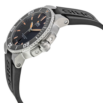 Stainless steel case with a black rubber strap. Uni-directional rotating stainless steel bezel with a black ceramic top ring. Black dial with luminous silver-tone hands and stick hour markers. Minute markers around the outer rim. Dial Type: Analog. Luminescent hands and markers. Date display at the 6 o'clock position. Automatic movement with a 38-hour power reserve. Scratch resistant sapphire crystal. Screw down crown. Skeleton case back. Case diameter: 43 mm. Case thickness: 14 mm. Round case shape. Fold over clasp with safety release. Water resistant at 300 meters / 1000 feet. Functions: date, hour, minute, second. Casual watch style. Watch label: Swiss Made. Oris Aquis Automatic Black Dial Stainless Steel Men's Watch 733-7653-4159RS.
