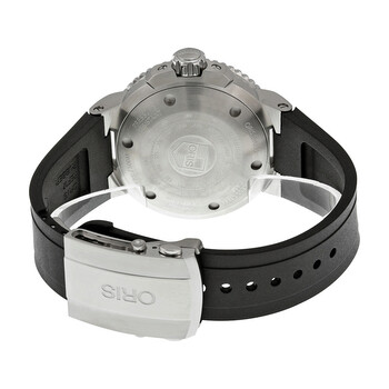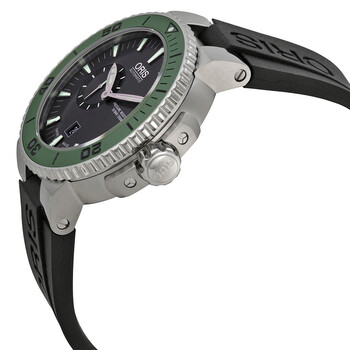 Stainless steel case with a black rubber strap. Uni-directional rotating stainless steel bezel with green ion-plated top ring. Black dial with luminous silver-tone hands and index hour markers. Minute markers around the outer rim. Dial Type: Analog. Luminescent hands and markers. Date display at the 6 o'clock position. Small seconds sub-dial at the 9 o'clock position. Automatic movement with a 38 hour power reserve. Scratch resistant sapphire crystal. Screw down crown. Solid case back. Case diameter: 46 mm. Case thickness: 16 mm. Round case shape. Band width: 25 mm. Fold over clasp. Water resistant at 500 meters / 1650 feet. Functions: date, hour, minute, second. Luxury watch style. Watch label: Swiss Made. Oris Aquis Automatic Black Dial Stainless Steel Black Rubber Men's Watch 743-7673-4157RS.