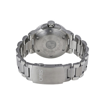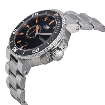 Stainless steel case with a stainless steel bracelet. Uni-directional rotating black ceramic bezel. Black dial with silver-tone hands and stick hour markers. Minute markers around the outer rim. Dial Type: Analog. Luminescent hands and markers. Date display at the 6 o'clock position. Small seconds sub-dial at the 9 o'clock position. Automatic movement. Calibre oris 743, base sw 220 engine. Scratch resistant sapphire crystal. Screw down crown. Solid case back. Case diameter: 46 mm. Case thickness: 15.50 mm. Round case shape. Band width: 22 mm. Band length: 8.5 inches. Fold over clasp. Water resistant at 500 meters / 1650 feet. Functions: date, hour, minute, second. Sport watch style. Watch label: Swiss Made. Item Variations: 743 7673 4159MB, 743.7673.4159MB, 74376734159MB. Oris Aquis Automatic Black Dial Stainless Steel Men's Watch 743-7673-4159MB.