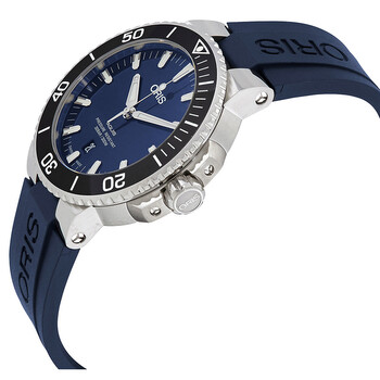 Stainless steel case with a blue rubber strap. Uni-directional rotating coin edge stainless steel bezel with a black ceramic ring. Blue dial with luminous silver-tone hands and index hour markers. Minute markers around the outer rim. Dial Type: Analog. Luminescent hands and markers. Date display at the 6 o'clock position. Oris calibre 733 automatic movement, based upon Sellita SW200-1, containing 26 Jewels, bitting at 28800 vph, and has a power reserve of approximately 38 hours. Scratch resistant sapphire crystal. Screw down crown. Transparent case back. Round case shape. Case size: 43.50 mm. Case thickness: 12.6 mm. Band width: 24 mm. Deployment clasp with a push button release. Water resistant at 300 meters / 1000 feet. Functions: date, hour, minute, second. Aquis Series. Dive watch style. Watch label: Swiss Made. Oris Aquis Automatic Blue Dial Men's Watch 733-7730-4135BLRS.