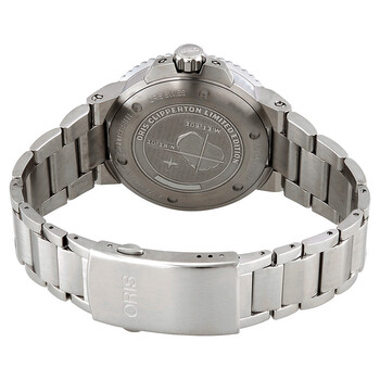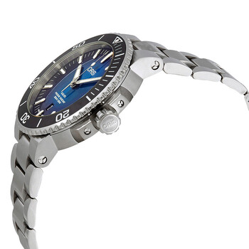 Silver-tone stainless steel case with a silver-tone stainless steel bracelet. Uni-directional rotating black ceramic bezel. Blue dial with silver-tone hands and index hour markers. Minute markers around the outer rim. Dial Type: Analog. Luminescent hands and markers. Date display at the 6 o'clock position. Oris 733, base SW 200-1 automatic movement with a 38-hour power reserve. Scratch resistant sapphire crystal. Screw down crown. Transparent case back. Round case shape, case size: 43.50 mm, case thickness: 12.6 mm. Band width: 24 mm. Fold over clasp. Water resistant at 300 meters / 1000 feet. Functions: date, hour, minute, second. Additional Info: limited to 2000 pieces. Dive watch style. Watch label: Swiss Made. Oris Aquis Automatic Blue Dial Men's Watch 01 733 7730 4185-Set MB.