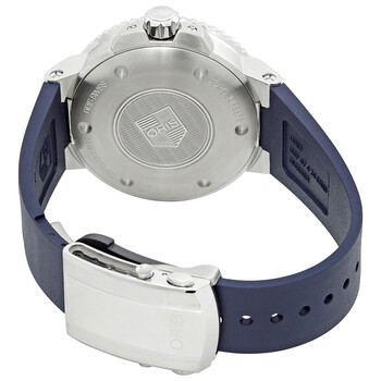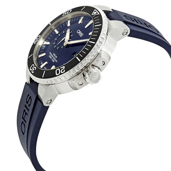 Stainless steel case with a blue rubber strap. Uni-directional rotating stainless steel bezel with a black ceramic top ring. Blue dial with luminous silver-tone hands and index hour markers. Minute markers around the outer rim. Dial Type: Analog. Luminescent hands and markers. Date display at the 3 o'clock position. Small seconds sub-dial at the 9 o'clock position. Oris 743, base SW 220-1 automatic movement with a 38-hour power reserve. Scratch resistant sapphire crystal. Screw down crown. Solid case back. Round case shape. Case size: 45.50 mm. Case thickness: 15 mm. Band width: 24 mm. Deployment clasp with a push button release. Water resistant at 500 meters / 1650 feet. Functions: date, hour, minute, second. Dive watch style. Watch label: Swiss Made. Oris Aquis Automatic Blue Dial Men's Watch 01 743 7733 4135-07 4 24 65EB.