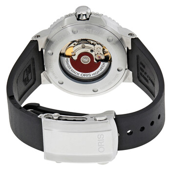 Stainless steel case with a black rubber strap. Uni-directional rotating coin edge stainless steel bezel with a black ceramic ring. Blue dial with luminous silver-tone hands and index hour markers. Minute markers around the outer rim. Dial Type: Analog. Luminescent hands and markers. Date display abovet the 6 o'clock position. Oris calibre 733 automatic movement, based upon Sellita SW200-1, containing 26 Jewels, bitting at 28800 vph, and has a power reserve of approximately 38 hours. Scratch resistant sapphire crystal. Screw down crown. Transparent case back. Round case shape. Case size: 43.5 mm. Case thickness: 12.6 mm. Band width: 24 mm. Fold over clasp with a push button release. Water resistant at 300 meters / 1000 feet. Functions: date, hour, minute, second. Aquis Series. Dive watch style. Watch label: Swiss Made. Oris Aquis Automatic Blue Dial Men's Watch 01-733-7730-4135-07-4-24-64eb.