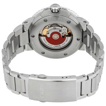 Stainless steel case with a stainless steel bracelet. Uni-directional rotating stainless steel bezel with an inlaid black ring. Blue dial with luminous silver-tone hands and index hour markers. Minute markers around the outer rim. Dial Type: Analog. Luminescent hands and markers. Date display at the 6 o'clock position. Oris calibre 733 automatic movement, based upon Sellita SW200-1, containing 26 Jewels, bitting at 28800 vph, and has a power reserve of approximately 38 hours. Anti-reflective scratch resistant sapphire crystal. Screw down crown. Transparent case back. Round case shape. Case size: 41.5 mm. Band width: 22 mm. Fold over clasp with a push button release. Water resistant at 300 meters / 1000 feet. Functions: date, hour, minute, second. Aquis Series. Dive watch style. Watch label: Swiss Made. Oris Aquis Automatic Blue Dial Watch 01 733 7766 4135-07 8 22 05PEB.