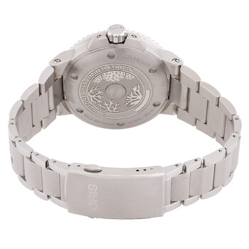 Silver-tone stainless steel case and bracelet. Uni-directional rotating black bezel. Blue dial with silver-tone hands and index hour markers. Minute markers around the outer rim. Dial Type: Analog. Luminescent hands and markers. Date display at the 3 o'clock position. Oris Calibre 798 Automatic movement, based upon SW330-1, containing 25 Jewels, bitting at 28800 vph, and has a power reserve of approximately 42 hours. Anti-reflective scratch resistant sapphire crystal. Screw down crown. Transparent case back. Round case shape, case size: 43.5 mm, case thickness: 12.60 mm. Push button folding clasp. Water resistant at 300 meters / 1000 feet. Functions: date, GMT, second time zone, hour, minute, second. Aquis Series. Dive watch style. Watch label: Swiss Made. Oris Aquis Automatic Blue Dial Watch 01 798 7754 4185-Set MB.
