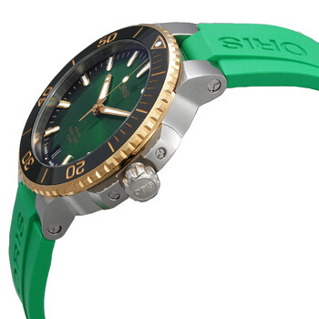 Two-tone (silver-tone and gold-tone) stainless steel & yellow gold case with a green rubber strap. Uni-directional rotating green 18kt yellow gold and ceramic bezel. Green dial with gold-tone hands and index hour markers. Dial Type: Analog. Luminescent hands and markers. Date display at the 6 o'clock position. Oris Calibre 400 Automatic movement, containing 21 Jewels, bitting at 28800 vph, and has a power reserve of approximately 120 hours. Scratch resistant sapphire crystal. Screw down crown. Transparent see through case back. Round case shape, case size: 41.5 mm. Band width: 22 mm. Fold over clasp with a safety release. Water resistant at 300 meters / 1000 feet. Functions: date, hour, minute, second. Aquis Series. Dive watch style. Watch label: Swiss Made. Oris Aquis Automatic Green Dial Men's Watch 01 400 7769 6357-07 4 22 77FC.