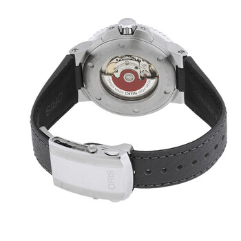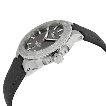 Silver-tone stainless steel case with a grey (calfskin) leather strap. Uni-directional rotating coin edge silver-tone stainless steel bezel. Grey dial with luminous silver-tone hands and index hour markers. Minute markers around the outer rim. Dial Type: Analog. Luminescent hands and markers. Date display at the 6 o'clock position. Oris Calibre 733 Automatic movement, based upon Sellita SW200-1, containing 26 Jewels, bitting at 28800 vph, and has a power reserve of approximately 38 hours. Scratch resistant sapphire crystal. Screw down crown. Transparent case back. Round case shape, case size: 43.5 mm, case thickness: 12.60 mm. Band width: 22 mm. Deployment clasp. Water resistant at 300 meters / 1000 feet. Functions: date, hour, minute, second. Aquis Series. Dive watch style. Watch label: Swiss Made. Oris Aquis Automatic Grey Dial Men's Watch 01 733 7730 4153-07 5 24 11EB.