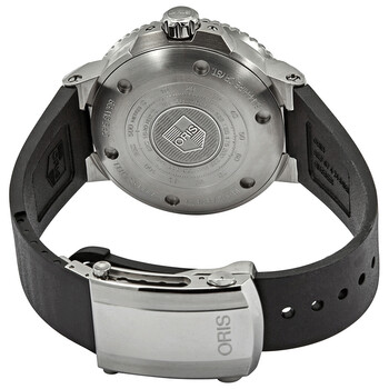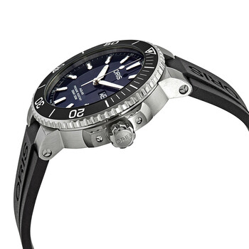 Stainless steel case with a black rubber strap. Uni-directional rotating coin edge stainless steel bezel with a black ceramic top ring. Blue dial with luminous silver-tone hands and index hour markers. Minute markers around the outer rim. Dial Type: Analog. Luminescent hands and markers. Day of the week and date display at the 3 o'clock position. Oris calibre 752, base SW 220-1 automatic movement, based upon SW 220-1, containing 26 Jewels, bitting at 28800 vph, and has a power reserve of approximately 38 hours. Scratch resistant sapphire crystal. Screw down crown. Solid case back. Round case shape. Case size: 45.5 mm. Band width: 24 mm. Fove over clasp with a push button release. Water resistant at 500 meters / 1650 feet. Functions: date, day, hour, minute, second. Aquis Big Day Date Series. Dive watch style. Watch label: Swiss Made. Oris Aquis Big Day Date Automatic Blue Dial Men's Watch 01 752 7733 4135-07 4 24 64EB.