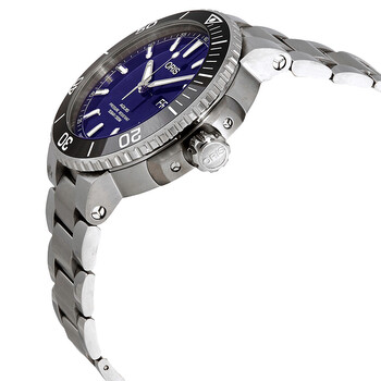 Stainless steel case with a stainless steel bracelet. Uni-directional rotating black stainless steel bezel with a bkack ceramic top ring. Blue dial with luminous silver-tone hands and index hour markers. Minute markers around the outer rim. Dial Type: Analog. Luminescent hands and markers. Day of the week and date display at the 3 o'clock position. Oris 752, base SW 220-1 automatic movement with a 38-hour power reserve. Scratch resistant sapphire crystal. Screw down crown. Solid case back. Round case shape. Case size: 45.5 mm. Case thickness: 15.65 mm. Band width: 24 mm. Deployment clasp with a push button release. Water resistant at 500 meters / 1650 feet. Functions: date, day, hour, minute, second. Dive watch style. Watch label: Swiss Made. Oris Aquis Big Day Date Automatic Men's Blue Dial Watch 01 752 7733 4135-07 8 24 05PEB.