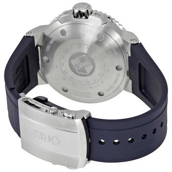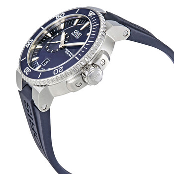 Silver-tone stainless steel case with a blue rubber strap. Blue dial with silver-tone hands and index hour markers. Minute markers around the outer rim. Dial Type: Analog. Date display at the 6 o'clock position. Small seconds sub-dial subdials. Automatic movement. Scratch resistant sapphire crystal. Case size: 46 mm. Round case shape. Band width: 26 mm. Deployment clasp. Water resistant at 50 meters / 165 feet. Functions: date, hour, minute, second. Luxury watch style. Watch label: Swiss Made. Oris Aquis Blue Dial Automatic Stainless Steel Men's Watch 743-7673-4135BLRS.
