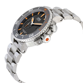 Titanium case with a titanium bracelet. Uni-directional rotating titanium bezel with a black ceramic top ring. Black dial with silver-tone hands and index hour markers. Minute markers around the outer rim. Dial Type: Analog. Luminescent hands and markers. Date display at the 3 o'clock position. Seconds sub-dial appears at the 8 o'clock position. Automatic movement with a 38-hour power reserve. Scratch resistant sapphire crystal. Screw down crown. Solid case back. Case diameter: 46 mm. Round case shape. Band width: 26 mm. Fold over clasp. Water resistant at 50 meters / 165 feet. Functions: date, hour, minute, second. Dress watch style. Watch label: Swiss Made. Oris Aquis Carlos Coste Black Dial Titanium Watch 743-7709-7184SET.