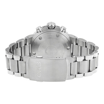 Titanium case with a titanium bracelet. Tungsten bezel. Grey dial with luminous silver-tone hands and index hour markers. Minute markers around the outer rim. Dial Type: Analog. Luminescent hands and markers. Date display at the 6 o'clock position. Chronograph - three sub-dials displaying: 60 second, 30 minute and 1/10th of a second. Automatic movement with a 48-hour power reserve. Scratch resistant sapphire crystal. Screw down crown. Solid case back. Case size: 46 mm. Case thickness: 13 mm. Round case shape. Band width: 26 mm. Band length: 8.5 inches. Deployment clasp with push button release. Water resistant at 500 meters / 1650 feet. Functions: chronograph, date, hour, minute, second. Casual watch style. Watch label: Swiss Made. Oris Aquis Chronograph Grey Dial Men's Watch 01 674 7655 7253-07 8 26 75PEB.