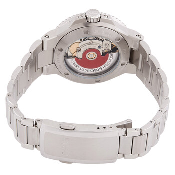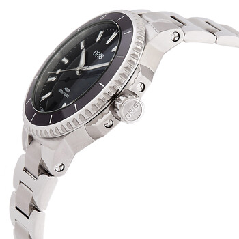 Silver-tone stainless steel case and bracelet. Uni-directional rotating black ceramic bezel. Black dial with silver-tone hands and index hour markers. Minute markers around the outer rim. Dial Type: Analog. Luminescent hands and markers. Date display at the 6 o'clock position. Oris Calibre 733 Automatic movement, based upon Sellita SW200-1, containing 26 Jewels, bitting at 28800 vph, and has a power reserve of approximately 38 hours. Scratch resistant sapphire crystal. Screw down crown. Transparent see through case back. Round case shape, case size: 36.50 mm. Folding clasp. Water resistant at 300 meters / 1000 feet. Functions: date, hour, minute, second. Aquis Date Series. Sport watch style. Watch label: Swiss Made. Oris Aquis Date Automatic Black Dial Ladies Watch 01 733 7792 4154-07 8 19 05P.