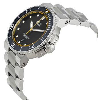 Stainless steel case with a stainless steel bracelet. Uni-directional rotating stainless steel bezel with a black ceramic top ring. Black dial with luminous silver-tone hands and index hour markers. Minute markers around the outer rim. Dial Type: Analog. Luminescent hands and markers. Date display at the 6 o'clock position. Oris calibre 733 base SW 200-1 automatic movement with a 38-hour power reserve. Scratch resistant sapphire crystal. Screw down crown. Transparent case back. Case size: 43 mm. Case thickness: 12.60 mm. Round case shape. Bracelet width: 26 mm. Deployment clasp with a push button release. Water resistant at 300 meters / 1000 feet. Functions: date, hour, minute, second. Luxury watch style. Oris Aquis Date Automatic Black Dial Men's Watch 01 733 7653 4127-07 8 26 01PEB.