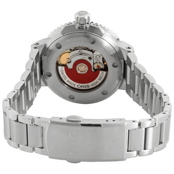 Stainless steel case with a stainless steel bracelet. Uni-directional rotating stainless steel bezel with a grey ceramic ring. Multicoloured dial with silver-tone hands and index hour markers. Minute markers around the outer rim. Dial Type: Analog. Luminescent hands and markers. Date display at the 6 o'clock position. Oris calibre 733 automatic movement, based upon Sellita SW200-1, containing 26 Jewels, bitting at 28800 vph, and has a power reserve of approximately 38 hours. Scratch resistant sapphire crystal. Screw down crown. Transparent case back. Round case shape. Case size: 36.5 mm. Bracelet width: 18 mm. Fold over clasp. Water resistant at 300 meters / 1000 feet. Functions: date, hour, minute, second. Aquis Series. Dive watch style. Watch label: Swiss Made. Oris Aquis Date Automatic Multicoloured Dial Men's Watch 01 733 7770 4150-SET.