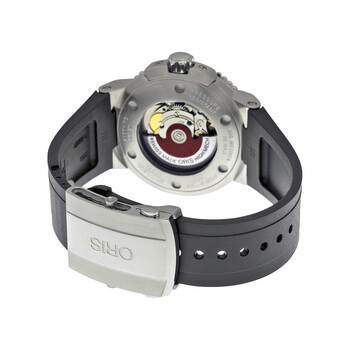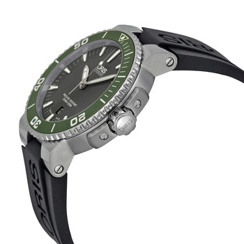 Stainless steel case with a black rubber strap. Uni-directional rotating stainless steel bezel with a green ceramic top ring. Grey dial with luminous silver-tone hands and index hour markers. Minute markers around the outer rim. Dial Type: Analog. Luminescent hands and markers. Date display at the 6 o'clock position. Oris caliber 733 automatic movement with a 38-hour power reserve. Scratch resistant sapphire crystal. Screw down crown. Skeleton case back. Case size: 43 mm. Case thickness: 14 mm. Round case shape. Band width: 22 mm. Deployment clasp with a push button release. Water resistant at 300 meters / 1000 feet. Functions: date, hour, minute, second. Sport watch style. Watch label: Swiss Made. Item Variations: 733 7653 4137RS, 733.7653.4137RS, 73376534137RS. Oris Aquis Date Grey Dial Black Rubber Men's Watch 733-7653-4137RS.