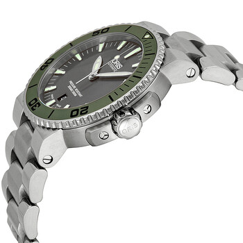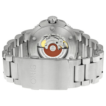 Stainless steel case with a stainless steel bracelet. Uni-directional rotating stainless steel bezel with green ceramic top ring. Grey dial with silver-tone hands and index hour markers. Minute markers around the outer rim. Dial Type: Analog. Luminescent hands and markers. Date display at the 6 o'clock position. Automatic movement with 38 hour power reserve. Scratch resistant sapphire crystal. Screw down crown. Transparent case back. Case diameter: 43 mm. Case thickness: 13 mm. Round case shape. Folding clasp. Water resistant at 300 meters / 1000 feet. Functions: date, hour, minute, second. Sport watch style. Watch label: Swiss Made. Oris Aquis Date Grey Dial Stainless Steel Men's Watch 733-7653-4157MB.