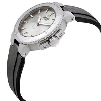 Stainless steel case with a grey rubber strap. Uni-directional rotating stainless steel bezel. Silver dial with luminous silver-tone hands and index hour markers. Minute markers around the outer rim. Dial Type: Analog. Luminescent hands and markers. Date display at the 6 o'clock position. Oris 733, Base SW 200-1 automatic movement with a 38-hour power reserve. Scratch resistant sapphire crystal. Screw down crown. Transparent case back. Round case shape. Case size: 36 mm. Case thickness: 11.90 mm. Band width: 18 mm. Fold over clasp. Water resistant at 300 meters / 1000 feet. Functions: date, hour, minute, second. Casual watch style. Watch label: Swiss Made. Item Variations: 733 7652 4141RS, 733.7652.4141RS, 73376524141RS. Oris Aquis Date Silver Dial Automatic Ladies Watch 01 733 7652 4141-07 5 18 14FC.