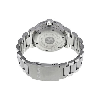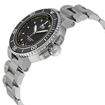 Stainless steel case with a stainless steel bracelet. Uni-directional rotating silver-tone bezel with black ceramic top ring. Black dial with luminous silver-tone hands and index hour markers. Minute markers. Depth scale around the outer rim. Dial Type: Analog. Luminescent hands and markers. Date display at the 6 o'clock position. Automatic movement with 38 hour power reserve. Scratch resistant domed anti-reflective sapphire crystal. Screw down crown. Solid case back. Case diameter: 46 mm. Round case shape. Band width: 25 mm. Folding clasp with extension. Water resistant at 500 meters / 1650 feet. Functions: date, hour, minute, second. Additional Info: waterproof presentation box set, additional rubber strap, professional strap changing tools. Sport watch style. Watch label: Swiss Made. Oris Aquis Depth Gauge Black Dial Stainless Steel Men's Watch 733-7675-4154SET.