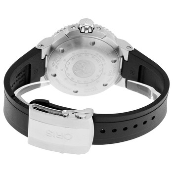 Stainless steel case with a black rubber strap. Uni-directional rotating stainless steel bezel with a grey ceramic top ring. Blue dial with luminous silver-tone hands and index hour markers. Minute markers around the outer rim. Dial Type: Analog. Luminescent hands and markers. Date display at the 6 o'clock position. Seconds sub-dial at 9 o'clock position. Sellita SW220 automatic movement with a 38-hour power reserve. Scratch resistant sapphire crystal. Screw down crown. Solid case back. Case size: 46 mm. Case thickness: 16 mm. Round case shape. Band width: 25 mm. Fold over clasp with a safety release. Water resistant at 500 meters / 1650 feet. Functions: date, hour, minute, second. Additional Info: in general, suitable for short periods of recreational swimming, but not diving or snorkeling. Sport watch style. Watch label: Swiss Made. Item Variations: 01 743 7673 4135-07 4 26 34EB. Oris Aquis Diver Date Blue Dial Black Rubber Men's Watch 743-7673-4135RS.