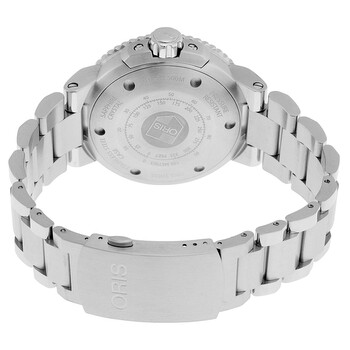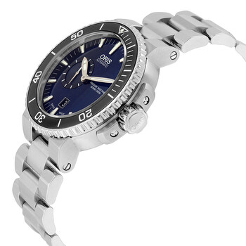 Stainless steel case with a stainless steel bracelet. Uni-directional rotating stainless steel bezel with a black ceramic top ring. Blue dial with silver-tone hands and index hour markers. Minute markers around the outer rim. Dial Type: Analog. Luminescent hands and markers. Date display at the 6 o'clock position. Seconds sub-dial at 9 o'clock position. Automatic movement. Scratch resistant sapphire crystal. Screw down crown. Solid case back. Case diameter: 46 mm. Case thickness: 15.50 mm. Round case shape. Band width: 26 mm. Band length: 9 inches. Fold over clasp with a safety release. Water resistant at 500 meters / 1650 feet. Functions: date, hour, minute, second. Dress watch style. Watch label: Swiss Made. Item Variations: 01 743 7673 4135-07 8 26 01PEB. Oris Aquis Small Second Date Men's Watch 743-7673-4135MB.