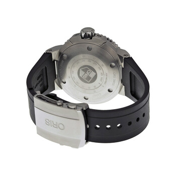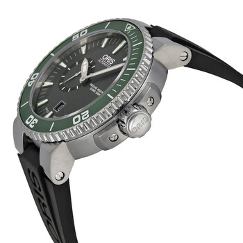 Stainless steel case with a black rubber strap. Uni-directional rotating green ceramic bezel. Grey dial with silver-tone hands and index hour markers. Minute markers around the outer rim. Dial Type: Analog. Luminescent hands and markers. Date display at the 6 o'clock position. One - 60 second. Oris Calibre 743, base SW 220-1 automatic movement with about 38 hours of power reserve. Scratch resistant sapphire crystal. Screw down crown. Solid case back. Case size: 46 mm. Round case shape. Fold over with safety release clasp. Water resistant at 500 meters / 1650 feet. Functions: date, hour, minute, second. Dress watch style. Watch label: Swiss Made. Item Variations: RS 01 743 7673 4137 Small Second Date. Oris Aquis Small Second Date Men's Watch 743-7673-4137RS.