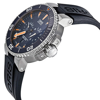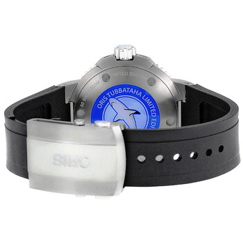 Grey titanium case with a black rubber strap. Bi-directional rotating coin edge titanium bezel with a blue PVD count-up elapsed time top ring. Blue dial with center hand indicates minutes hands and index hours indicated by sub-dila at the 3 o'clock position hour markers. Minute markers around the outer rim. Dial Type: Analog. Luminescent hands and markers. Date display at the 6 o'clock position. Second at the 9 o'clock position. 12 hour at the 3 o'clock position subdials. Oris Calibre 749, base SW 220-1 Automatic movement, based upon SW 220-1, containing 28 Jewels, bitting at 28800 vph, and has a power reserve of approximately 38 hours. Scratch resistant sapphire crystal. Screw down crown. Transparent case back. Round case shape, case size: 46 mm. Fold over clasp. Water resistant at 500 meters / 1650 feet. Functions: date, hour, minute, second. Additional Info: hours are displayed in the right-handed sub-dial. Aquis Series. Luxury watch style. Watch label: Swiss Made. Item Variations: 01 749 7663 7185 Set RS, 01 749 7663 7185.Set RS, 01 749 7663 7185Set RS. Oris Aquis Tubbataha Limited Edition Men's Watch 749-7663-7185SET.