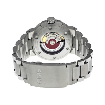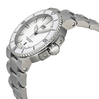 Stainless steel case with a stainless steel bracelet. Uni-directional rotating stainless steel bezel with a white ceramic top ring. White dial with silver-tone hands and index hour markers. Minute markers around the outer rim. Dial Type: Analog. Luminescent hands and markers. Date display above the 6 o'clock position. Automatic movement with a 38 hour power reserve. Scratch resistant sapphire crystal. Screw down crown. Skeleton case back. Case diameter: 43 mm. Round case shape. Band width: 26 mm. Folding with wxtension clasp. Water resistant at 300 meters / 1000 feet. Functions: date, hour, minute, second. Casual watch style. Watch label: Swiss Made. Oris Aquis White Dial Stainless Steel Automatic Men's Watch 733-7653-4156MB.