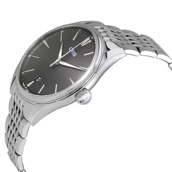 Silver-tone stainless steel case with a silver-tone stainless steel bracelet. Fixed smooth silver-tone stainless steel bezel. Grey dial with luminous silver-tone alpha-style shape hands and index hour markers. Minute markers around the outer rim. Dial Type: Analog. Luminescent hands and markers. Date display at the 6 o'clock position. Oris Calibre 733 Automatic movement, based upon Sellita SW200-1, containing 26 Jewels, bitting at 28800 vph, and has a power reserve of approximately 38 hours. Scratch resistant sapphire crystal. Pull / push crown. Transparent case back. Round case shape, case size: 40 mm, case thickness: 10.7 mm. Band width: 21 mm. Deployment with push button release clasp. Water resistant at 50 meters / 165 feet. Functions: date, hour, minute, second. Artelier Series. Casual watch style. Watch label: Swiss Made. Oris Artelier Automatic Grey Dial Men's Watch 01 733 7721 4053-07 8 21 79.