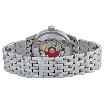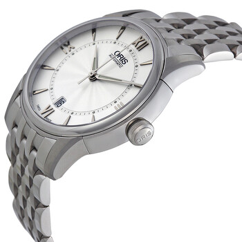 Stainless steel case with a stainless steel bracelet. Fixed stainless steel bezel. Silver dial with silver-tone hands and index hour markers. Roman numerals mark the 3, 6, 9 and 12 o'clock positions. minute markers around an inner ring. Dial Type: Analog. Luminescent hands and markers. Date display at the 6 o'clock position. Automatic movement with a 38-hour power reserve. Oris 733, base sw 200-1 engine. Scratch resistant sapphire crystal. Pull / push crown. Skeleton case back. Case diameter: 40 mm. Case thickness: 10.7 mm Round case shape. Band width: 22 mm. Band length: 7 inches. Deployment clasp. Water resistant at 50 meters / 165 feet. Functions: date, hour, minute, second. Dress watch style. Watch label: Swiss Made. Oris Artelier Automatic Silver Dial Men's Watch 733-7670-4071MB.