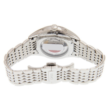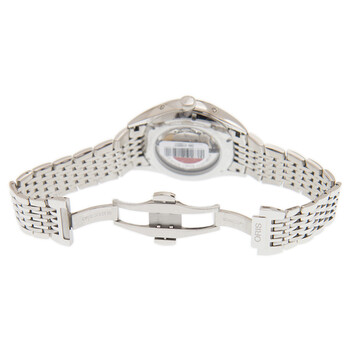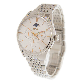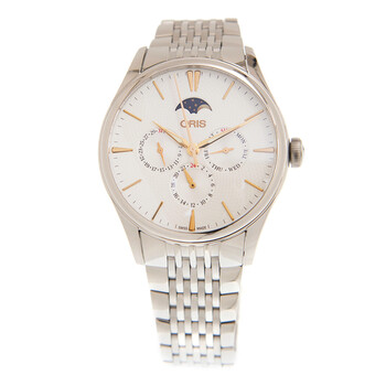 Silver-tone stainless steel case with a silver-tone stainless steel bracelet. Fixed silver-tone stainless steel bezel. Silver-tone dial with silver-tone hands and index hour markers. Minute markers around the outer rim. Dial Type: Analog. Date display at the 9 o'clock position. Four - 24 hour, date, day, moonphase subdials. Oris Calibre 781, base SW 200-1 automatic movement with a 38-hour power reserve. Scratch resistant sapphire crystal. Transparent case back. Round case shape. Case size: 40.5 mm. Band width: 21 mm. Hidden clasp. Water resistant at 50 meters / 165 feet. Functions: moon phase, date, day, GMT, second time zone, hour, minute, second. Additional Info: original box, international warranty card, manual (complete accessories). Luxury watch style. Watch label: Swiss Made. Oris Artelier Complication Automatic Silver Dial Unisex Watch 781 7729 4031 8 21 79.