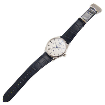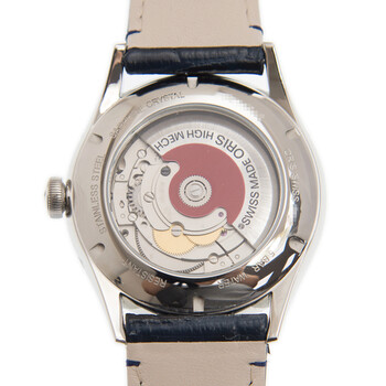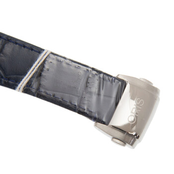 Silver-tone stainless steel case with a blue leather strap. Fixed silver-tone stainless steel bezel. Silver-tone dial with blue hands and index hour markers. Minute markers around the outer rim. Dial Type: Analog. Luminescent hands. Date display at the 9 o'clock position. Four - 24 hour, date, day, moonphase subdials. Oris Calibre 781, base SW 200-1 automatic movement with a 38-hour power reserve. Scratch resistant sapphire crystal. Transparent case back. Round case shape. Case size: 40 mm. Water resistant at 50 meters / 165 feet. Functions: moon phase, date, day, GMT, second time zone, hour, minute, second. Additional Info: original box, international warranty card, manual (complete accessories). Luxury watch style. Watch label: Swiss Made. Oris Artelier Complication Automatic Silver Dial Unisex Watch 781 7729 4051 5 21 66FC.
