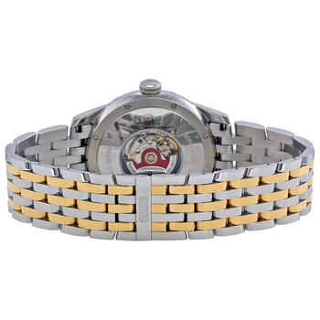 Stainless steel case with a two-tone (yellow gold and silver PVD) stainless steel bracelet. Fixed yellow gold PVD bezel. Silver dial with yellow gold-tone hands and index hour markers. Minute markers around the outer rim. Dial Type: Analog. Luminescent hands and markers. Three multi-function sub-dials displaying: date, day of the week and 24 hour. Moonphase display. Automatic movement with a 38-hour power reserve Scratch resistant sapphire crystal. Pull / push crown. Skeleton case back. Case diameter: 40.5 mm. Case thickness: 11 mm. Round case shape. Band width: 20 mm. Band length: 8.5 inches. Folding clasp. Water resistant at 30 meters / 100 feet. Functions: date, day, hour, minute, second, moonphase indicator. Casual watch style. Watch label: Swiss Made. Oris Artelier Complication Silver Dial Men's Multifunction Watch 01 582 7689 4351-07 8 21 78.