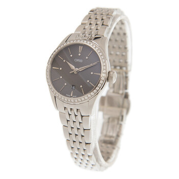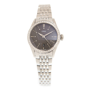 Silver-tone stainless steel case with a silver-tone stainless steel bracelet. Fixed silver-tone diamond set bezel. Grey dial with gold-tone hands and diamond index hour markers. Dial Type: Analog. Date display at the 6 o'clock position. Oris Calibre 561, base ETA 2671 automatic movement with a 38-hour power reserve. Scratch resistant sapphire crystal. Transparent case back. Round case shape. Case size: 28 mm. Hidden clasp. Water resistant at 50 meters / 165 feet. Functions: date, hour, minute, second. Additional Info: original box, international warranty card, manual (complete accessories). Luxury watch style. Watch label: Swiss Made. Oris Artelier Date Automatic Diamond Grey Dial Unisex Watch 561 7722 4953 8 14 79.
