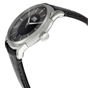 Stainless steel case with a black croco-embossed leather bracelet. Stainless steel bezel. Black guilloche dial with luminous silver-tone hands and index hour markers. Minute markers around the outer rim. Luminescent hands and markers. Date display at the 6 o'clock position. Seconds sub-dial at the 10 o'clock position. Automatic movement. Scratch resistant sapphire crystal. Steel crown. Skeleton case back. Case diameter: 40 mm. Deployment clasp. Water resistant at 30 meters / 100 feet. Oris Artelier Date Automatic Men's Watch 733-7591-4054LS.