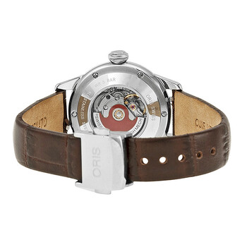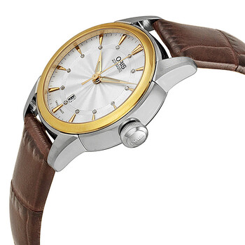 Stainless steel case with a brown leather strap. Fixed yellow gold-plated bezel. Silver dial with gold-tone hands and index and diamond hour markers. Minute markers around the outer rim. Dial Type: Analog. Date display at the 6 o'clock position. Automatic movement. Scratch resistant sapphire crystal. Transparent case back. Case diameter: 31 mm. Round case shape. Folding clasp. Water resistant at 50 meters / 165 feet. Functions: date, hour, minute, second. Dress watch style. Watch label: Swiss Made. Oris Artelier Date Automatic Silver Dial Brown Leather Ladies Watch 01 561 7687 4351-07 5 14 70FC.