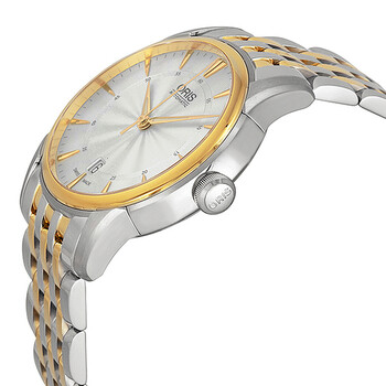 Stainless steel case with a two-tone (silver-tone and yellow gold PVD) stainless steel bracelet. Fixed yellow gold PVD bezel. Silver dial with luminous yellow gold-tone hands and index hour markers. Minute markers around the outer rim. Dial Type: Analog. Luminescent hands and markers. Date display at the 6 o'clock position. Oris calibre 733 automatic movement with a 38-hour power reserve. Scratch resistant sapphire crystal. Pull / push crown. Skeleton case back. Round case shape. Case size: 40 mm. Case thickness: 11.1 mm. Band width: 21 mm. Fold over clasp. Water resistant at 30 meters / 100 feet. Functions: date, hour, minute, second. Casual watch style. Watch label: Swiss Made. Oris Artelier Date Automatic Silver Dial Men's Watch 01 733 7670 4351-07 8 21 78.