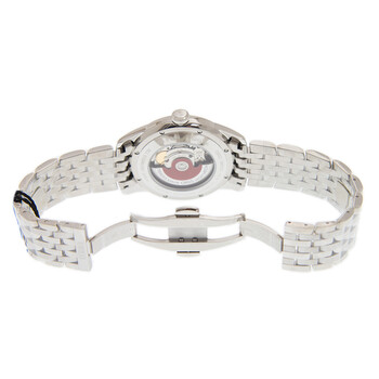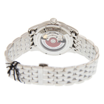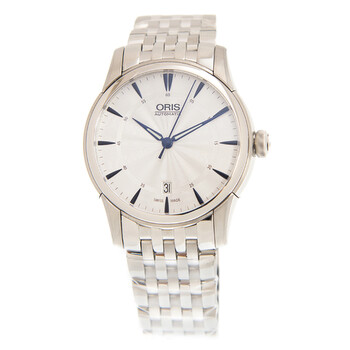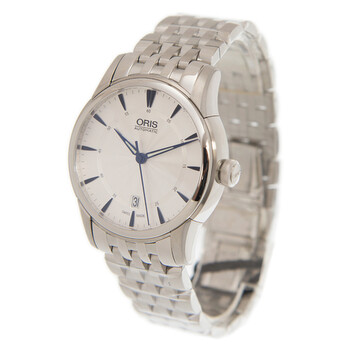 Silver-tone stainless steel case with a silver-tone stainless steel bracelet. Fixed silver-tone stainless steel bezel. Silver-tone dial with blue hands and index hour markers. Minute markers around the outer rim. Dial Type: Analog. Date display at the 3 o'clock position. Oris Calibre 733 automatic movement with a 38-hour power reserve. Scratch resistant sapphire crystal. Transparent case back. Round case shape. Case size: 40.5 mm. Hidden clasp. Water resistant at 50 meters / 165 feet. Functions: date, hour, minute, second. Additional Info: original box, international warranty card, manual (complete accessories). Luxury watch style. Watch label: Swiss Made. Oris Artelier Date Automatic Silver Dial Unisex Watch 733 7670 4031 8 21 77.