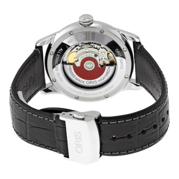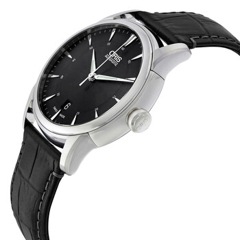 Stainless steel case with a black leather strap. Fixed stainless steel bezel. Black dial with silver-tone hands and index hour markers. Minute markers around the outer rim. Dial Type: Analog. Luminescent hands and markers. Date display at the 6 o'clock position. Oris 733 automatic movement with a 38-hour power reserve. Scratch resistant sapphire crystal. Transparent case back. Case size: 40 mm. Round case shape. Band width: 21 mm. Butterfly clasp. Water resistant at 30 meters / 100 feet. Functions: date, hour, minute, second. Casual watch style. Watch label: Swiss Made. Oris Artelier Date Black Dial Men's Watch 01 733 7670 4054-07 8 21 77.