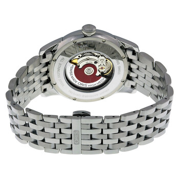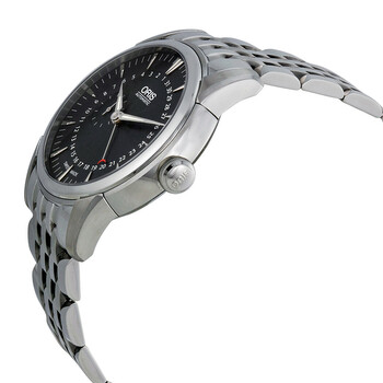 Silver-tone stainless steel case with a silver-tone stainless steel bracelet. Fixed silver-tone stainless steel bezel. Black dial with silver-tone alpha-style shape hands and index hour markers. Date scale around an inner ring. minute markers around the outer rim. Dial Type: Analog. Luminescent hands. One subdial displaying: small second at the 9 o'clock position. Oris Calibre 744 Automatic movement, based upon SW 220-1, containing 28 Jewels, bitting at 28800 vph, and has a power reserve of approximately 38 hours. Scratch resistant sapphire crystal. Pull / push crown. Skeleton case back. Round case shape, case size: 42 mm, case thickness: 12 mm. Band width: 22 mm. Fold over clasp. Water resistant at 50 meters / 165 feet. Functions: date, hour, minute, second. Artelier Pointer Date Series. Casual watch style. Watch label: Swiss Made. Oris Artelier Pointer Date Black Dial Men's Watch 01 744 7665 4054-07 8 22 77.