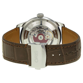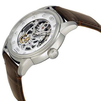 Stainless steel case with a black leather strap. Fixed bezel. Skeleton dial (with pink and gold detail) with silver-tone hands and diamond hour markers. Dial Type: Analog. Automatic movement. Scratch resistant domed anti-reflective Sapphire crystal. Transparent exhibition see through case back. Case diameter: 40.5 mm. Round case shape. Folding clasp. Water resistant at 50 meters / 165 feet. Functions: hour, minute, second. Dress watch style. Watch label: Swiss Made. Oris Artelier Skeleton Dial Black Leather Diamond Men's Watch 01 734 7670 4019-07 5 21 70FC.