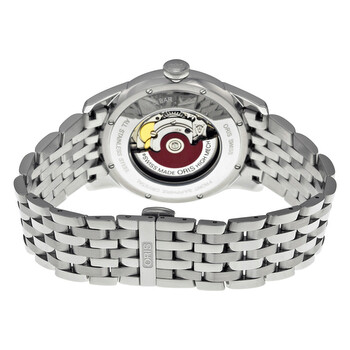Silver-tone stainless steel case with a silver-tone stainless steel bracelet. Fixed silver-tone stainless steel bezel. Silver guilloche dial with luminous silver-tone hands and index hour markers. Date scale around an inner ring . minute markers around the outer rim. Dial Type: Analog. Luminescent hands and markers. One subdial displaying: small second at the 9 o'clock position. Oris Calibre 744 Automatic movement, based upon SW 220-1, containing 28 Jewels, bitting at 28800 vph, and has a power reserve of approximately 38 hours. Scratch resistant sapphire crystal. Skeleton case back. Round case shape, case size: 42 mm, case thickness: 12 mm. Band width: 22 mm. Fold over with push button release clasp. Water resistant at 50 meters / 165 feet. Functions: date, hour, minute, second. Artelier Series. Dress watch style. Watch label: Swiss Made. Item Variations: 744 7665 4051MB, 744.7665.4051MB, 74476654051MB. Oris Artelier Small Second Pointer Date Automatic Silver Dial Men's Watch 744-7665-4051MB.