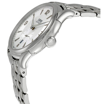 Stainless steel case with a stainless steel link bracelet. Fixed stainless steel bezel. Silver dial with silver-tone hands and index hour markers. Arabic numerals mark the 3, 9 and 12 o'clock positions. Minute markers around the outer rim. Date display appears at the 6 o'clock position. Small seconds sub-dial at the 6 o'clock position. Automatic movement. Scratch resistant sapphire crystal. Skeleton case back. Case diameter: 40 mm. Case thickness: 11.25 mm. Hidden folding deployment clasp. Water resistant at 30 meters/ 100 feet. Functions: hours, minutes, seconds, calendar. Oris Artelier Stainless Steel Men's Watch 623-7582-4071MB.