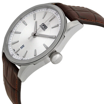 Stainless steel case with a brown leather strap. Fixed stainless steel bezel. Silver dial with luminous silver-tone hands and index hour markers. Minute markers around the outer rim. Dial Type: Analog. Luminescent hands and markers. Date display at the 6 o'clock position. Automatic movement. Scratch resistant sapphire crystal. Pull / push crown. Skeleton case back. Case diameter: 42 mm. Round case shape. Slip through clasp with push button release. Water resistant at 100 meters / 330 feet. Casual watch style. Watch label: Swiss Made. Item Variations: 01 733 7642 4031 07 5 21 80FC. Oris Artix Automatic Silver Dial Brown Leather Men's Watch 733-7642-4031LS.
