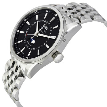 Stainless steel case with a stainless steel bracelet. Fixed stainless steel bezel. Black dial with luminous silver-tone hands and index / Arabic numeral hour markers. Date scale around an inner ring. Minute markers around the outer rim. Dial Type: Analog. Luminescent hands and markers. Day of the week and month display above center dial. Moonphase sub-dial. Oris calibre 915, base SW 200-1 / DD 9000 automatic movement with a 38-hour power reserve. Scratch resistant sapphire crystal. Pull / push crown. Transparent case back. Case size: 42 mm. Case thickness: 13 mm. Round case shape. Band width: 21 mm. Deployment clasp. Water resistant at 100 meters / 330 feet. Functions: full calendar, moon phase, month, date, day, hour, minute, second. Luxury watch style. Watch label: Swiss Made. Oris Artix Complication Moonphase Automatic Men's Watch 915-7643-4034MB.