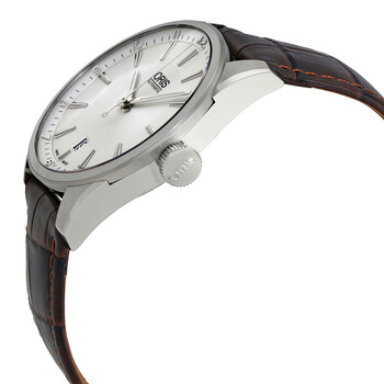 Silver-tone stainless steel case with a dark brown leather strap. Fixed silver-tone stainless steel bezel. Silver dial with silver-tone hands and index hour markers. Dial Type: Analog. Luminescent hands and markers. Date display at the 3 o'clock position. Oris 733, base SW 200-1 automatic movement with a 38-hour power reserve. Scratch resistant sapphire crystal. Case size: 39 mm. Round case shape. Band width: 19 mm. Water resistant at 100 meters / 330 feet. Functions: date, hour, minute, second. Dress watch style. Watch label: Swiss Made. Oris Artix Date Silver Dial Automatic Men's Watch 01 733 7713 4031-07 5 19 80FC.