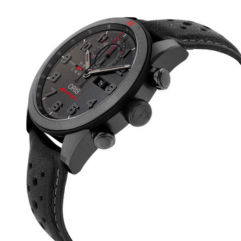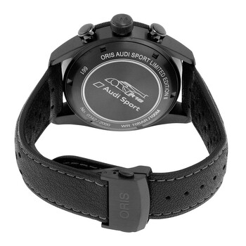 Black DLC titanium case with a black leather strap. Fixed black ceramic bezel showing tachymeter markings. Black dial with luminous black hands and Arabic numeral hour markers. Minute markers. Tachymeter markings around the outer rim. Dial Type: Analog. Luminescent hands and markers. Day of the week and date display at the 3 o'clock position. Chronograph - sub-dials displaying: linea seconds display. Combination 30 minute and 10 minute countdown sub-dial. Automatic movement with a 48-hour power reserve. Scratch resistant sapphire crystal. Solid case back. Case diameter: 44 mm. Case thickness: 14.9 mm. Round case shape. Band width: 22 mm. Band length: 8.5 inches. Fold over clasp. Water resistant at 100 meters / 330 feet. Functions: chronograph, tachymeter, date, hour, minute, second. Casual watch style. Watch label: Swiss Made. Oris Artix GT Audi Sport Chronograph Black Dial Black Leather Watch 778-7661-7784SET.