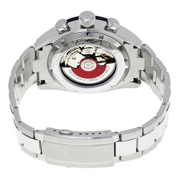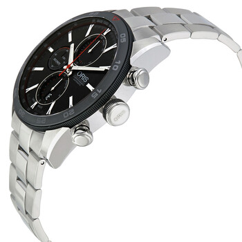 Stainless steel case with a stainless steel bracelet. Uni-directional rotating black ceramic bezel. Black dial with luminous silver-tone hands and index hour markers. Minute markers. Tachymeter markings around the outer rim. Dial Type: Analog. Luminescent hands and markers. Date display at the 6 o'clock position. Chronograph - three sub-dials displaying: 60 seconds, 30 minutes, and 12 hours. Oris calibre 774, base SW 500 automatic movement with a 48-hour power reserve. Scratch resistant sapphire crystal. Screw down crown. Transparent case back. Case size: 44 mm. Case thickness: 14.9 mm. Round case shape. Band width: 22 mm. Fold over clasp. Water resistant at 100 meters / 330 feet. Functions: chronograph, tachymeter, date, hour, minute, second. Sport watch style. Watch label: Swiss Made. Oris Artix GT Chronograph Automatic Black Dial Men's Watch 01 774 7661 4424-07 8 22 87.