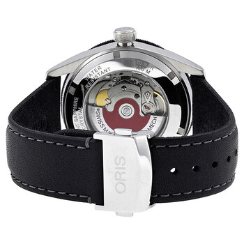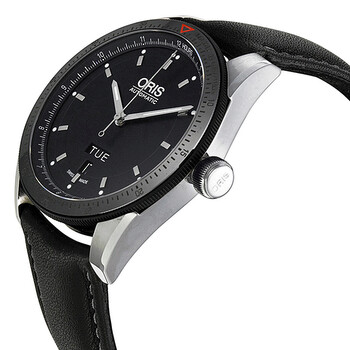 Stainless steel case with a black leather strap. Uni-directional rotating black PVD bezel. Black dial with silver-tone hands and stick hour markers. Minute markers around the outer rim. Dial Type: Analog. Luminescent hands and markers. Day of the week and date display at the 6 o'clock position. Automatic movement. Scratch resistant sapphire crystal. Screw down crown. Skeleton case back. Case diameter: 42 mm. Case thickness: 15 mm. Round case shape. Band width: 21 mm. Fold over clasp. Water resistant at 100 meters / 330 feet. Functions: date, day, hour, minute, second. Sport watch style. Watch label: Swiss Made. Oris Artix GT Day Date Automatic Black Dial Men's Watch 735-7662-4434LS.