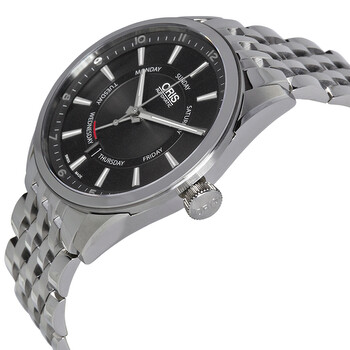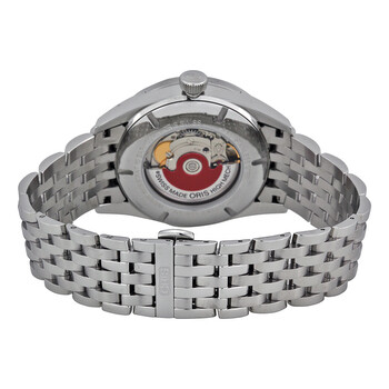 Stainless steel case with a stainless steel bracelet. Fixed stainless steel bezel. Black dial with luminous silver-tone hands and index / Arabic numeral hour markers. Day of the week. minute markers around the outer rim. Dial Type: Analog. Luminescent hands and markers. Date display at the 6 o'clock position. Oris 755, base SW 220-1 automatic movement with about 38 hours of power reserve. Scratch resistant sapphire crystal. Pull / push crown. Skeleton case back. Case size: 42 mm. Round case shape. Deployment clasp. Water resistant at 100 meters / 330 feet. Functions: date, day, hour, minute, second. Casual watch style. Watch label: Swiss Made. Item Variations: 01 755 7691 4054 07 8 21 80. Oris Artix Pointer Moon Automatic Silver Dial Men's Watch 755-7691-4054MB.